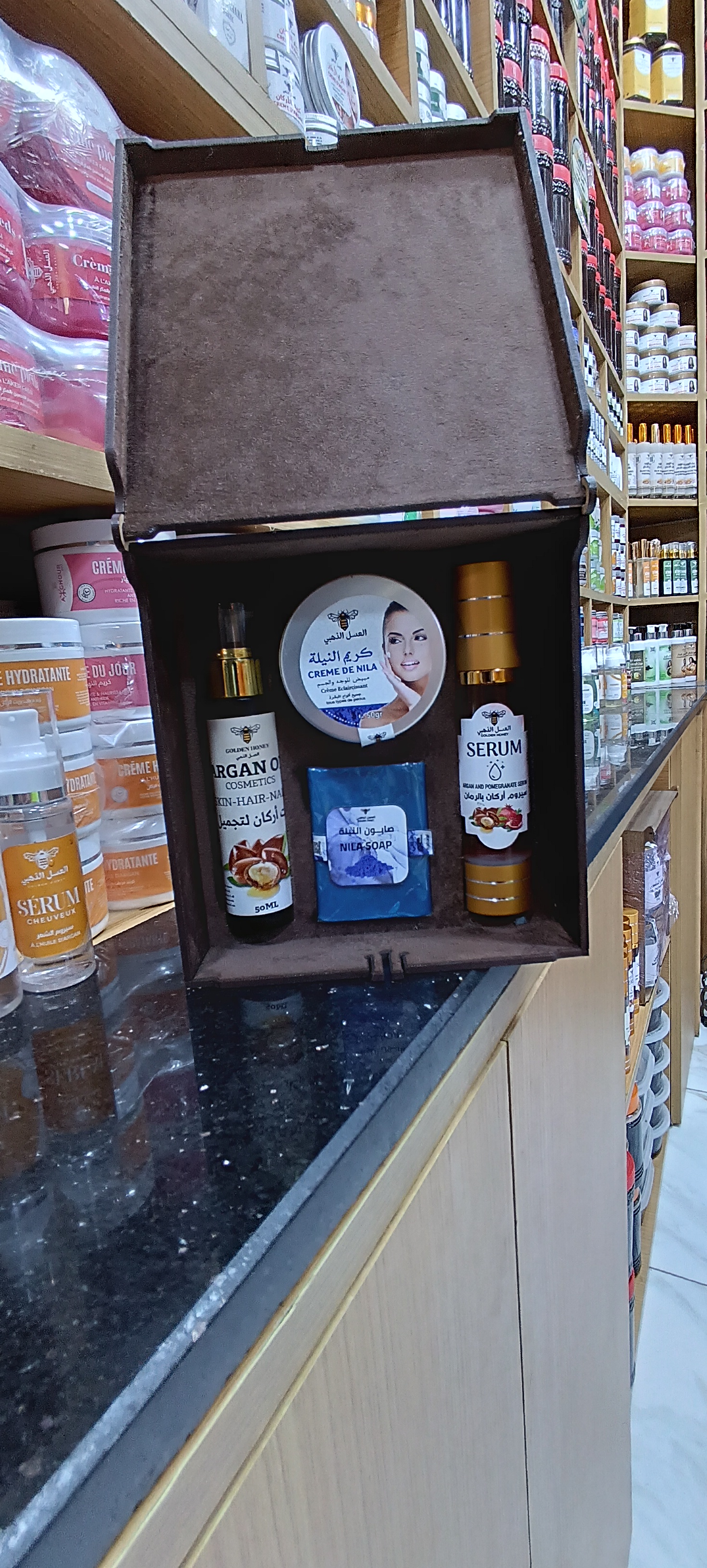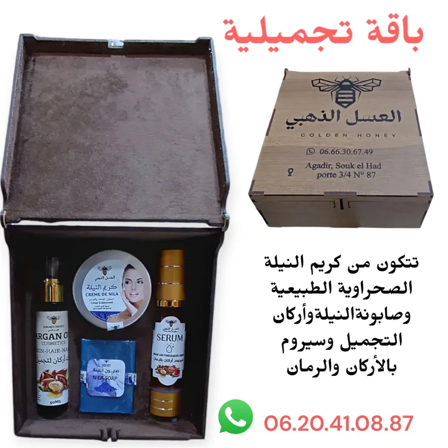تتكون من مواد تجميلية طبيعية مثل سيروم الأركان والرمان و كريم النيلة الصحراوية الطبيعية و الأركان التجميل و صابونة النيلة